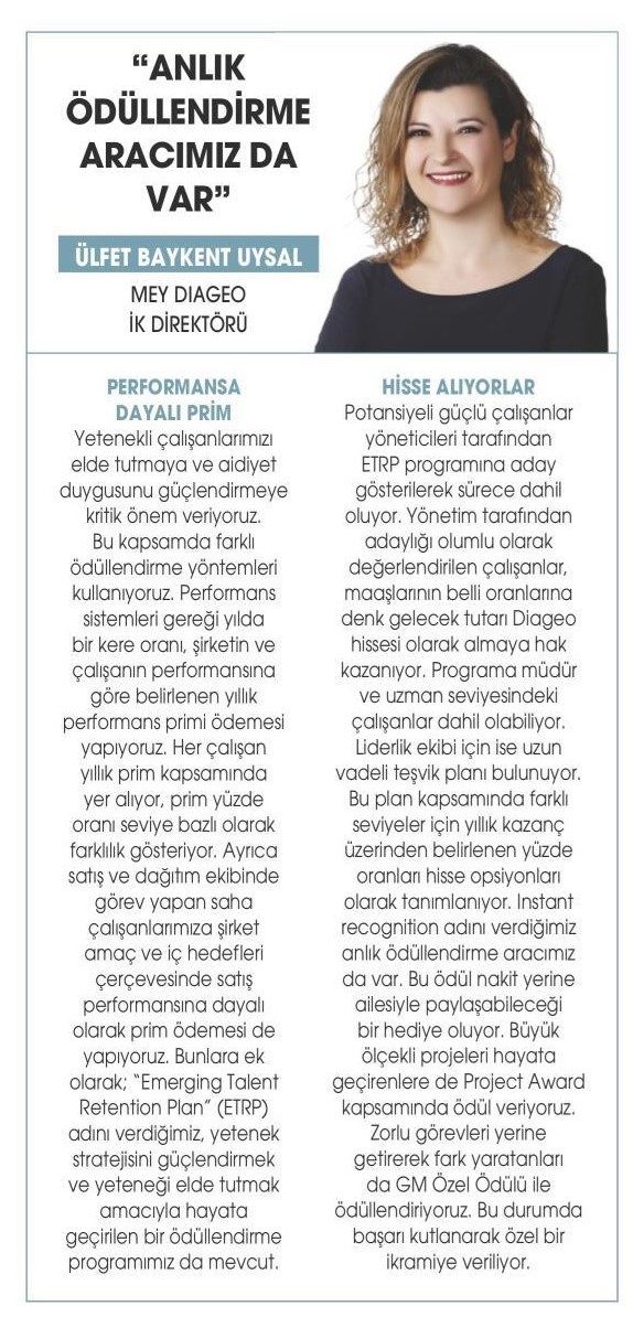 Employees with strong potential are nominated for the ETRP program by their managers and included in the process. Employees whose nominations are positively evaluated by the management become eligible to receive a portion of their salary in Diageo shares. The program is open to employees at the manager and specialist levels. For the leadership team, there is a long-term incentive plan. Within this plan, percentage ratios based on annual earnings are defined as stock options for different levels. We also have an instant recognition tool called "Instant Recognition," which provides a reward that can be shared with the employee's family, rather than cash. Those who successfully implement large-scale projects are awarded under the Project Award. Those who make a difference by completing challenging tasks are also recognized with the GM Special Award, where success is celebrated with a special bonus.