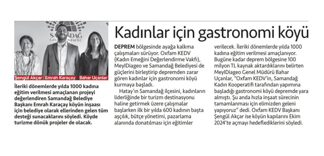 Efforts to rebuild in the earthquake-affected region are ongoing. Oxfam KEDV (Foundation for the Support of Women's Work), Mey|Diageo, and the Municipality of Samandağ have joined forces to establish a gastronomy village for women affected by the earthquake.
