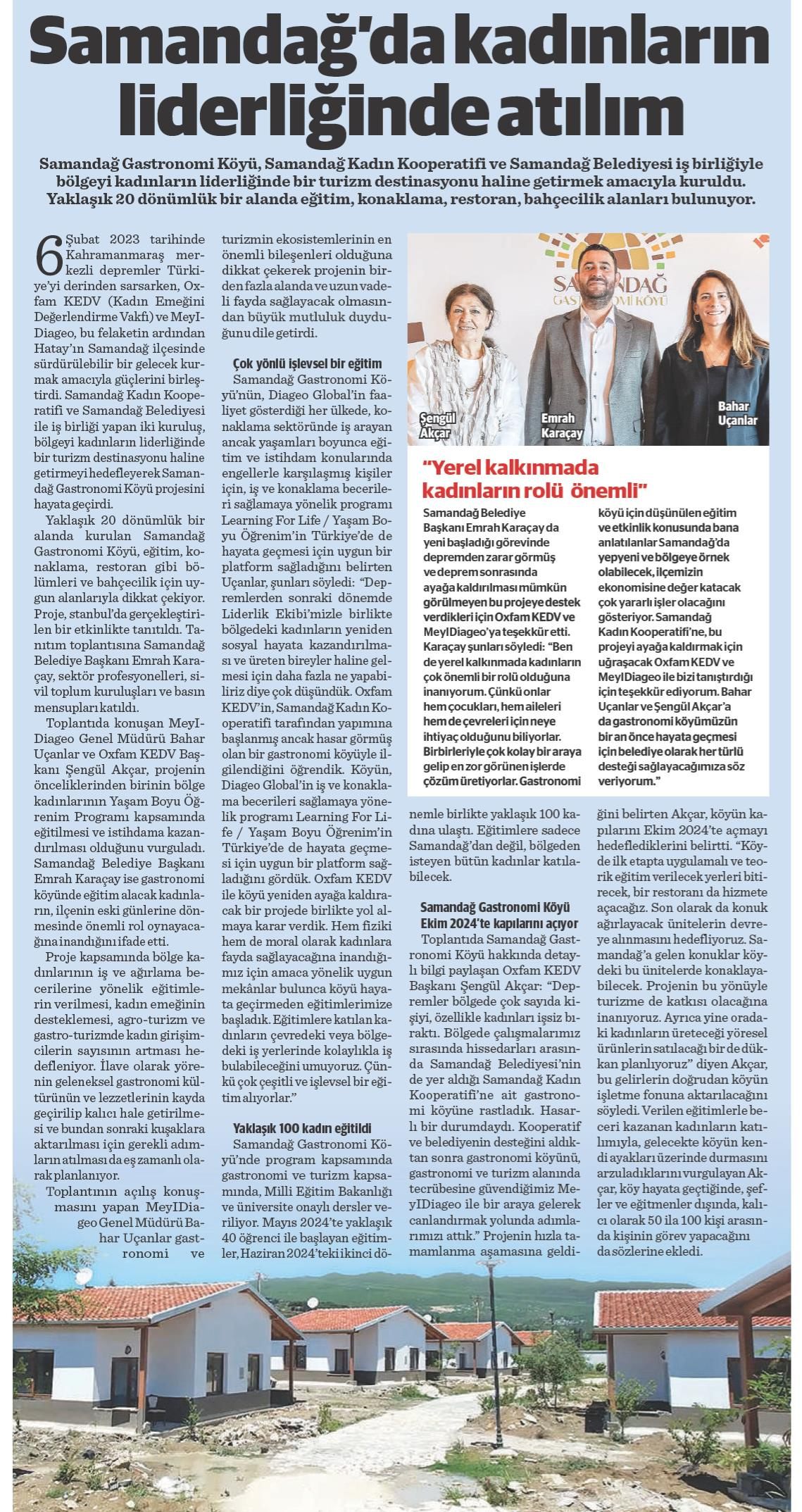On February 6, 2023, while the earthquakes centred in Kahramanmaraş deeply shook Türkiye, Oxfam KEDV (Foundation for the Support of Women's Work) and Mey|Diageo joined forces to build a sustainable future in Samandağ, Hatay, following this disaster. Collaborating with Samandağ Women's Cooperative and Samandağ Municipality, these two organizations launched the Samandağ Gastronomy Village project with the aim of making the region a tourism destination led by women.