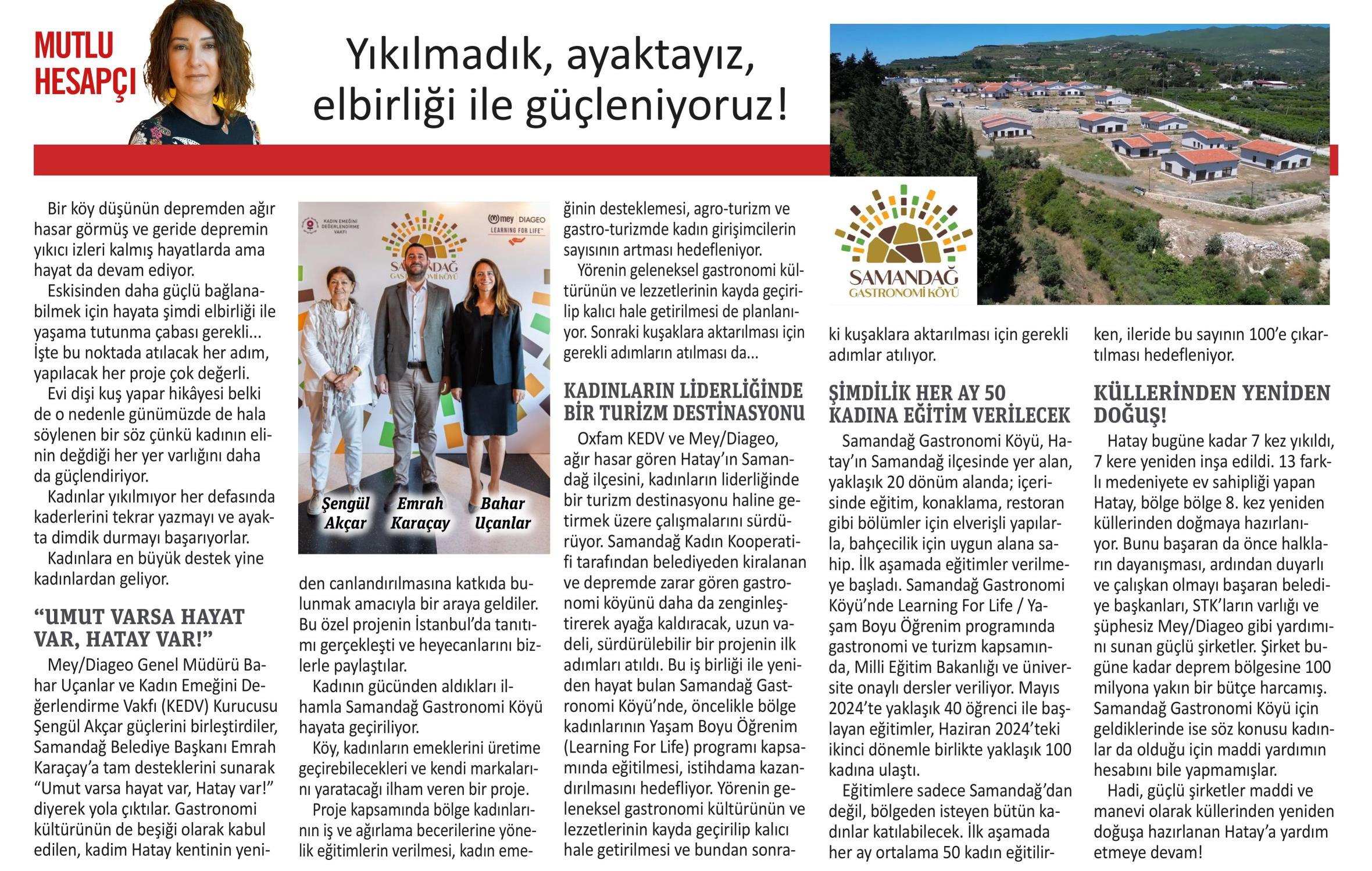 Oxfam, KEDV, and Mey|Diageo are working to transform the heavily damaged Samandağ district of Hatay into a tourism destination under women's leadership. The initial steps of a long-term, sustainable project to enrich and revive the gastronomy village, which was damaged in the earthquake and leased from the municipality by the Samandağ Women's Cooperative, have been taken. This collaboration aims to train local women and integrate them into employment within the Learning For Life program in the revived Samandağ Gastronomy Village. Steps are being taken to document, preserve, and pass on the region's traditional gastronomic culture and flavours to future generations.