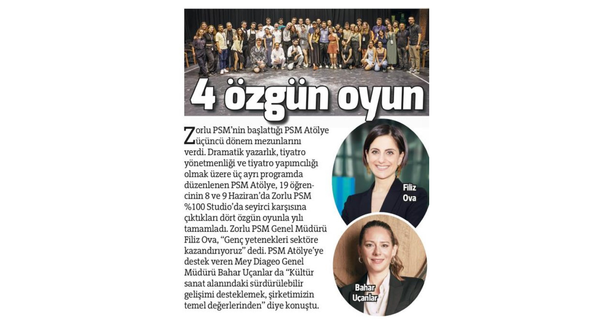 Zorlu PSM's PSM Atölye has graduated its third cohort. The PSM Atölye program, which includes three separate tracks in dramatic writing, theater directing, and theater production, concluded the year with four original plays presented by 19 students at Zorlu PSM %100 Studio on June 8th and 9th. Filiz Ova, General Manager of Zorlu PSM, stated, "We are bringing young talents into the industry." Bahar Uçanlar, General Manager of Mey|Diageo, who supports PSM Atölye, added, "Supporting sustainable development in the cultural and arts field is one of our core values."
