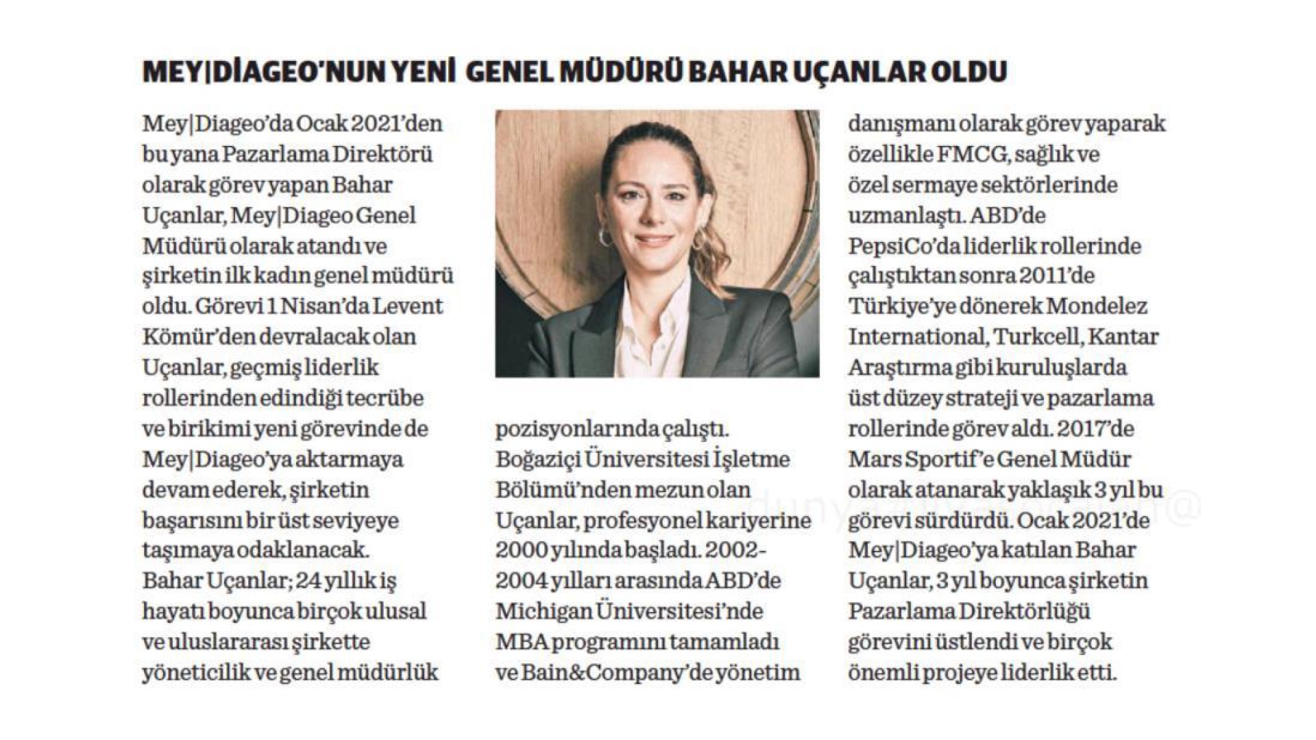 Bahar Ucanlar, who has been serving as the Marketing Director at Mey|Diageo since January 2021, has been appointed as the General Manager of Mey|Diageo, becoming the company's first female general manager. Ucanlar, who will take over the position from Levent Komur on April 1st, will focus on bringing the company's success to the next level by transferring her experience and expertise gained from past leadership roles to her new role at Mey|Diageo. Throughout her 24-year career, Bahar Ucanlar has held managerial and general management positions in many national and international companies. A graduate of Boğaziçi University's Business Administration Department, Ucanlar began her professional career in 2000. She completed her MBA program at the University of Michigan in the United States between 2002 and 2004, and worked as a management consultant at Bain & Company, specializing in FMCG, healthcare, and private equity sectors. After holding leadership roles at PepsiCo in the United States, she returned to Turkey in 2011 and held senior strategy and marketing positions at organizations such as Mondelez International, Turkcell, and Kantar Research. In 2017, she was appointed as the General Manager of Mars Sportive, where she served in this role for approximately 3 years. Joining Mey|Diageo in January 2021, Bahar Ucanlar held the position of Marketing Director for 3 years and led many important projects.