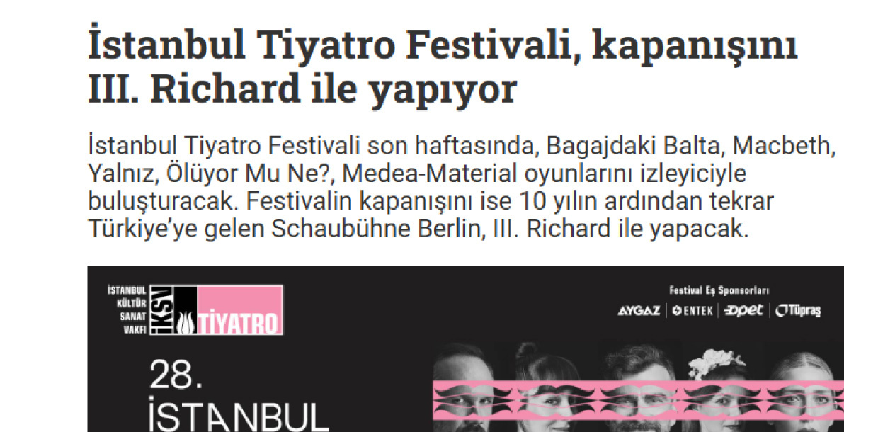 In its final week, the Istanbul Theater Festival will feature Bagajdaki Balta (The Axe in the Trunk), Macbeth, Yalnız (Alone), Ölüyor Mu Ne? (Is He Dying?), and Medea-Material, all set to meet the audience. The festival will close with III. Richard by Schaubühne Berlin, returning to Turkey after 10 years.