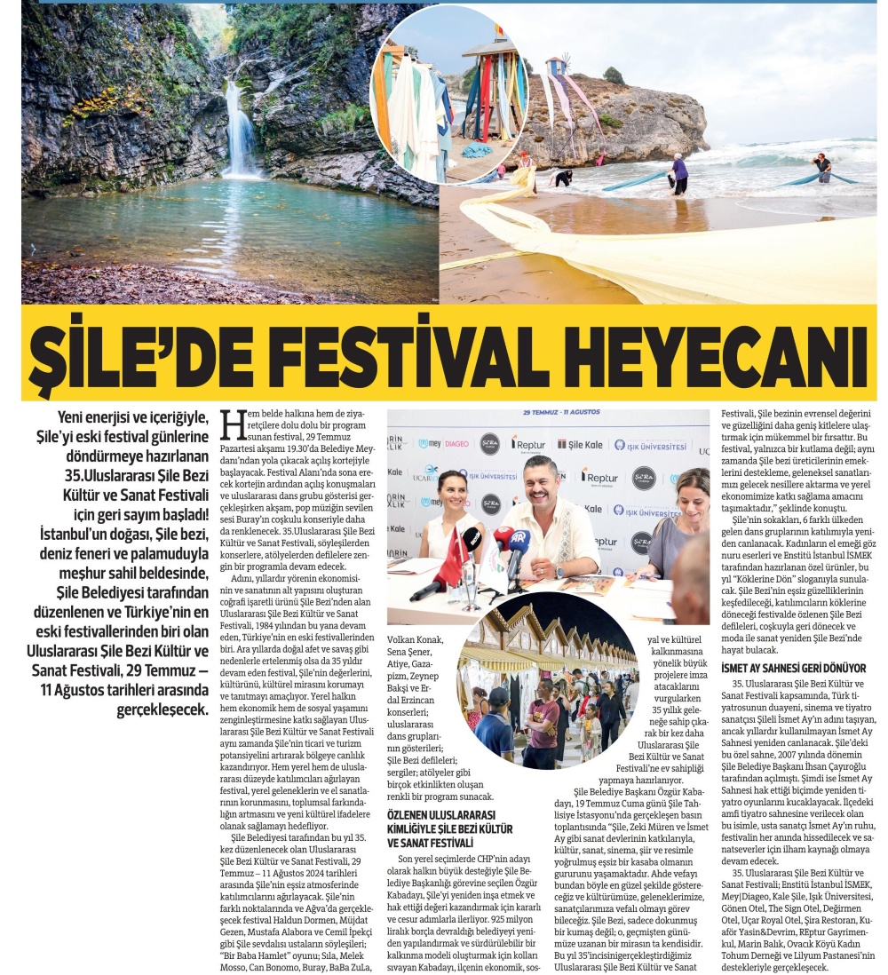 The 35th International Şile Cloth Culture and Art Festival, organized by the Şile Municipality for the 35th time this year, will host participants from July 29 to August 11, 2024, in the unique atmosphere of Şile. The festival will take place at various locations in Şile and Ağva and will feature a colorful program including talks by Şile enthusiasts like Haldun Dormen, Müjdat Gezen, Mustafa Alabora, and Cemil İpekçi; the play Bir Baba Hamlet; concerts by Sila, Melek Mosso, Can Bonomo, Buray, BaBa ZuLa, Volkan Konak, Sena Şener, Ati242, Gazapizm, Zeynep Bakşi, and Erdal Erzincan; performances by international dance groups; Şile Cloth fashion shows; exhibitions; workshops; and many other events.