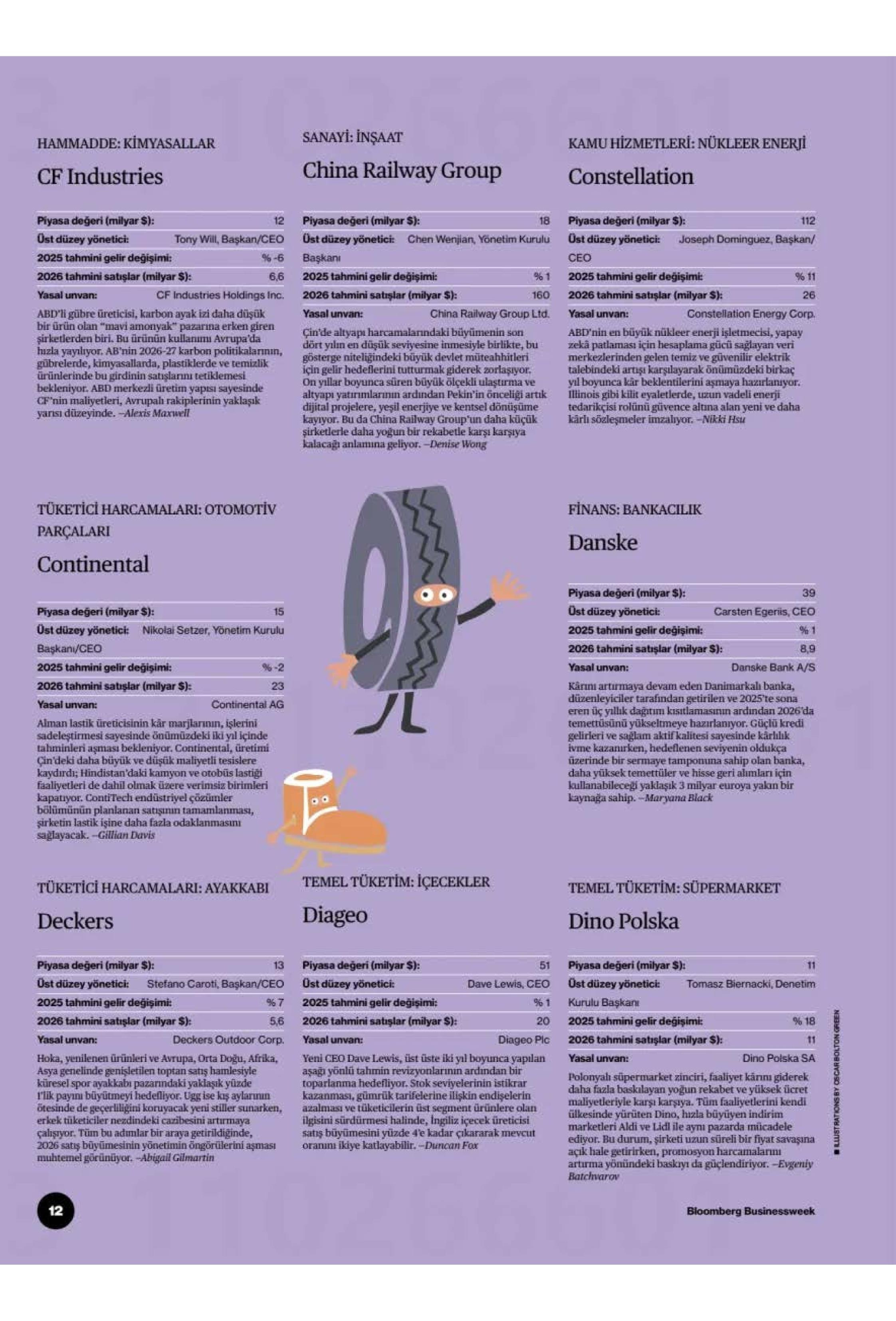 Bloomberg Intelligence’taki (BI) analistler, bilgisayar ve otomotivden finans ve gıdaya kadar uzanan sektörlerde binlerce şirketi izliyor. İşte önümüzdeki yıl (iyi ya da kötü yönde) dikkatle takip edilmesi gerektiğini düşündükleri 50 şirket. Bu analiz, aykırı bakış açılarını; yeni liderlikler, varlık satışları ya da satın almalar ile ürün ve hizmet planları gibi değişim tetikleyicileriyle birleştiriyor. Liste oluşturulurken BI ayrıca ABD'nin değişen gümrük tarifesi politikalarının olası etkilerine, hayati önemdeki kaynakların tedarikini güvence altına alma yarışına ve yapay zekânın dönüştürücü etkilerine odaklandı.