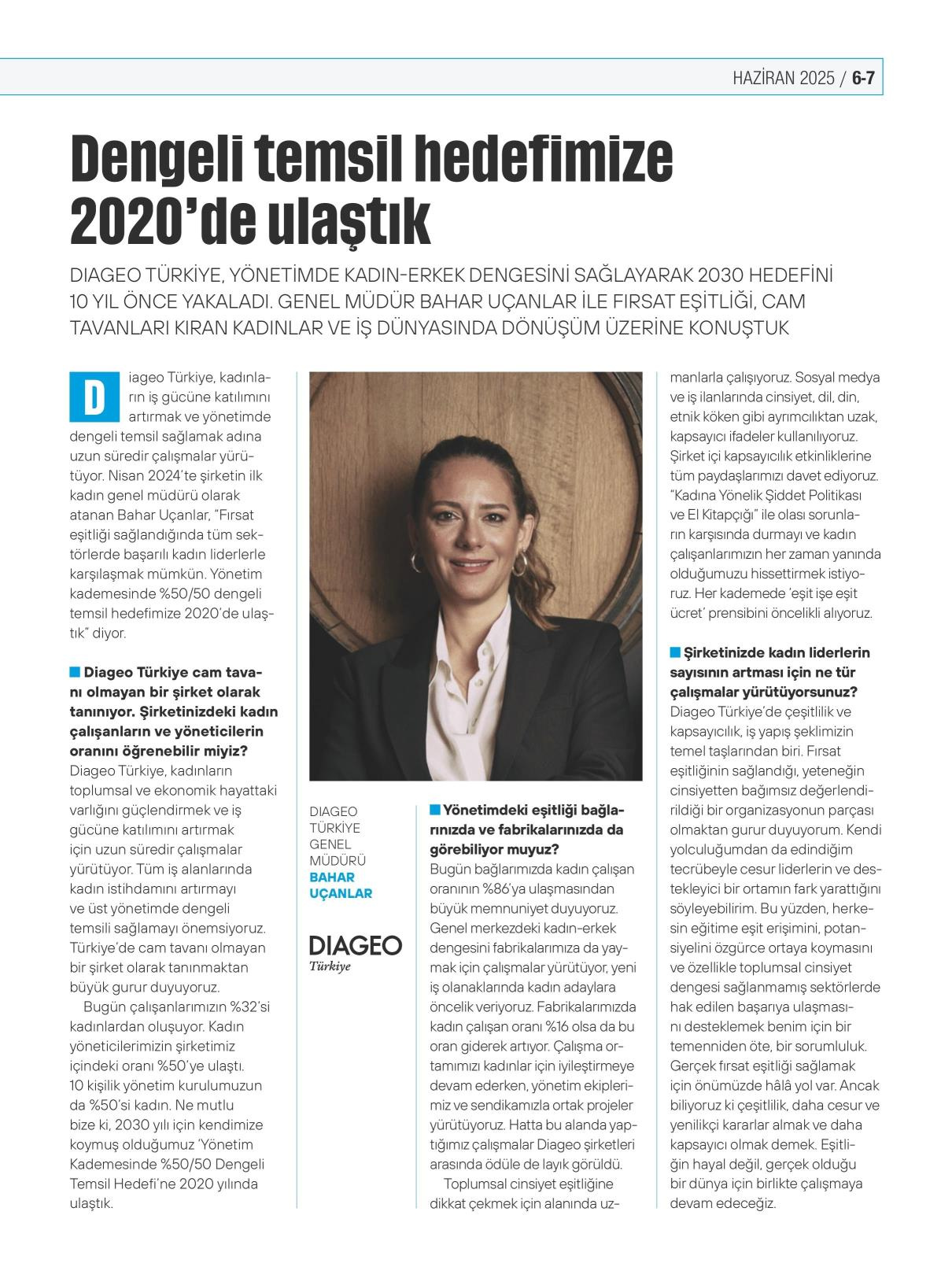 Diageo Türkiye, yönetimde kadın-erkek dengeli temsil hedefini küresel takviminden 10 yıl önce yakaladı. Şirket, 2030 için belirlediği %50/50 dengeli temsil hedefine 2020 yılında ulaştı. Nisan 2024’te Diageo Türkiye’nin ilk kadın genel müdürü olarak atanan Bahar Uçanlar, fırsat eşitliği, cam tavanları kıran kadınlar ve iş dünyasında dönüşüm üzerine değerlendirmelerde bulundu.