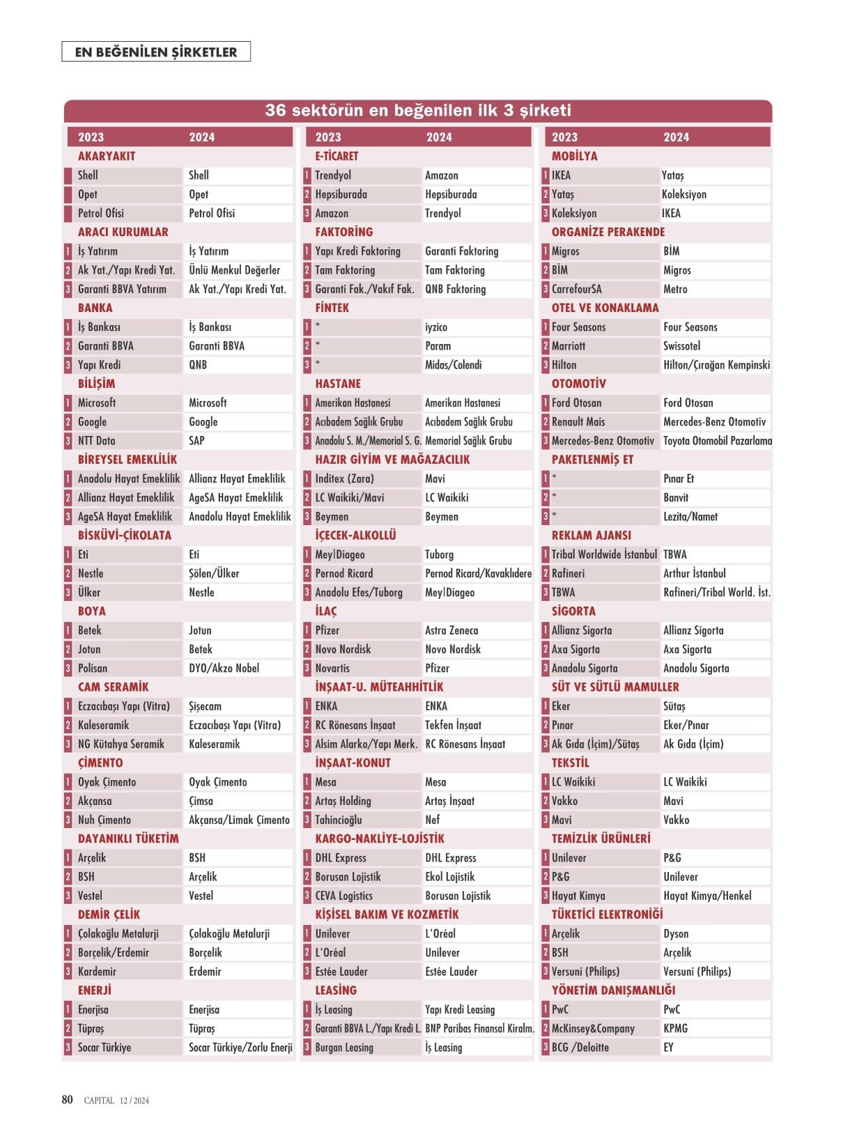 Capital, 25 yıldır "İş Dünyasının En Beğenilen Şirketlerini belirtiyor. Müşterileri, çalışanları ve toplum için yarattığı değerle öne çıkan, güvenilirlik, finansal sağlamlık ve itibar kriterlerinde rakiplerine fark atan şirketleri ilk 20 listesinde bir araya getiriyor. Bu yıl da ZENNA Araştırma'nın katkılarıyla hazırlanan listede, Koç Holding, "En Beğenilenler" listesinde zirveyi bırakmadı. Arçelik ikincilik, İş Bankası üçüncülük, Eczacıbaşı Topluluğu dördüncülük koltuğunu korudu. THY bir basamak çıkarak dördüncülüğe, Unilever 4 basamak çıkarak beşinciliğe yerleşti. Listede tam 20 şirket yer değiştirdi.