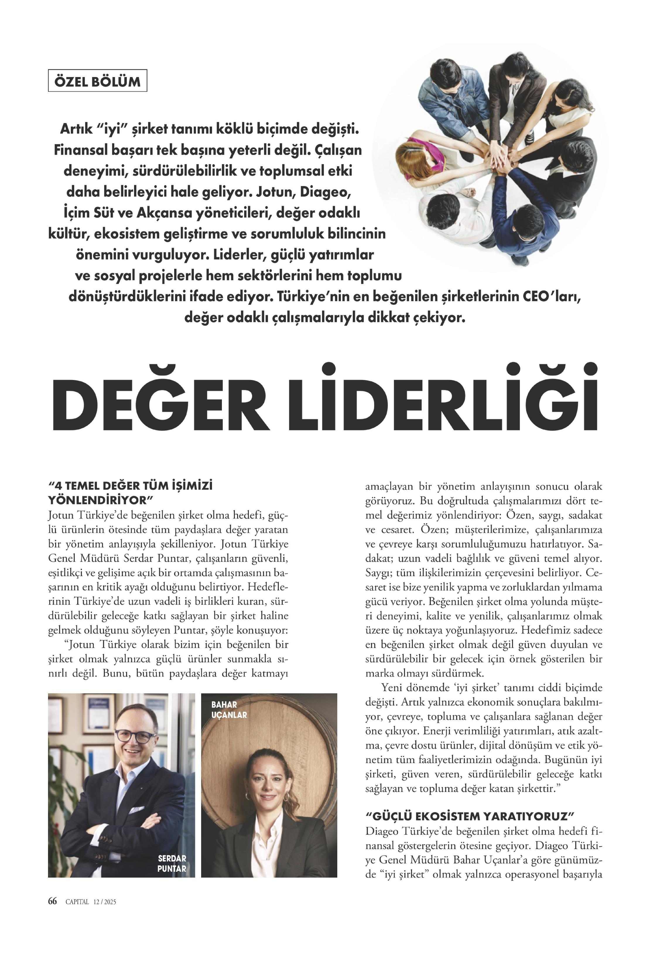 Artık "iyi" şirket tanımı köklü biçimde değişti. Finansal başarı tek başına yeterli değil. Çalışan deneyimi, sürdürülebilirlik ve toplumsal etki daha belirleyici hale geliyor. JOTUN, DIAGEO, İÇİM SÜT ve AKÇANSA yöneticileri, değer odaklı kültür, ekosistem geliştirme ve sorumluluk bilincinin önemini vurguluyor. Liderler, güçlü yatırımlar ve sosyal projelerle hem sektörlerini hem toplumu dönüştürdüklerini ifade ediyor. Türkiye'nin en beğenilen şirketlerinin CEO'ları, değer odaklı çalışmalarıyla dikkat çekiyor.