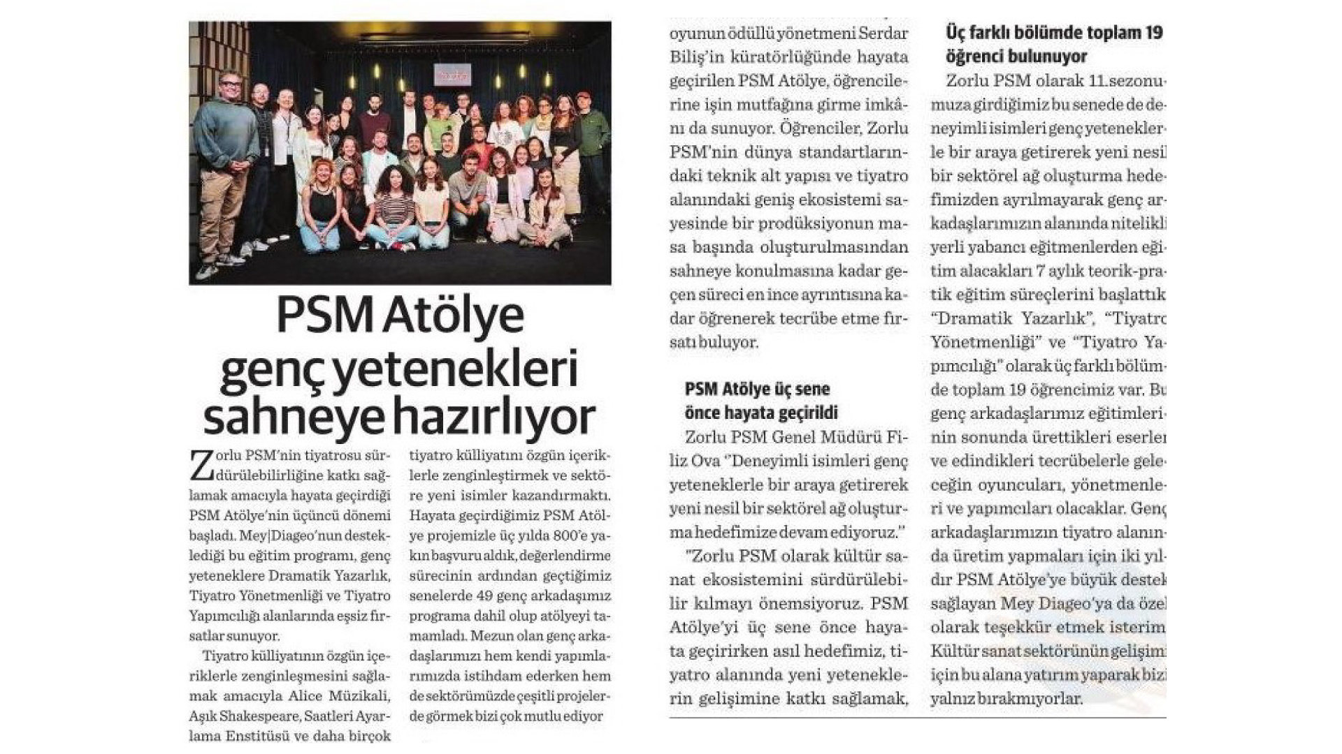 Zorlu PSM olarak 11.sezonumuza girdiğimiz bu senede de deneyimli isimleri genç yeteneklerle bir araya getirerek yeni nesil bir sektörel ağ oluşturma hedefimizden ayrılmayarak genç arkadaşlarımızın alanında nitelikli yerli yabancı eğitmenlerden eğitim alacakları 7 aylık teorik-pratik eğitim süreçlerini başlattık. “Dramatik Yazarlık”, “Tiyatro Yönetmenliği” ve “Tiyatro Yapımcılığı” olarak üç farklı bölümde toplam 19 öğrencimiz var. Bu genç arkadaşlarımız eğitimlerinin sonunda ürettikleri eserler ve edindikleri tecrübelerle geleceğin oyuncuları, yönetmenleri ve yapımcıları olacaklar. Genç arkadaşlarımızın tiyatro alanında üretim yapmaları için iki yıldır PSM Atölye’ye büyük destek sağlayan Mey Diageo'ya da özel olarak teşekkür etmek isterim. Kültür sanat sektörünün gelişimi için bu alana yatırım yaparak bizi yalnız bırakmıyorlar.