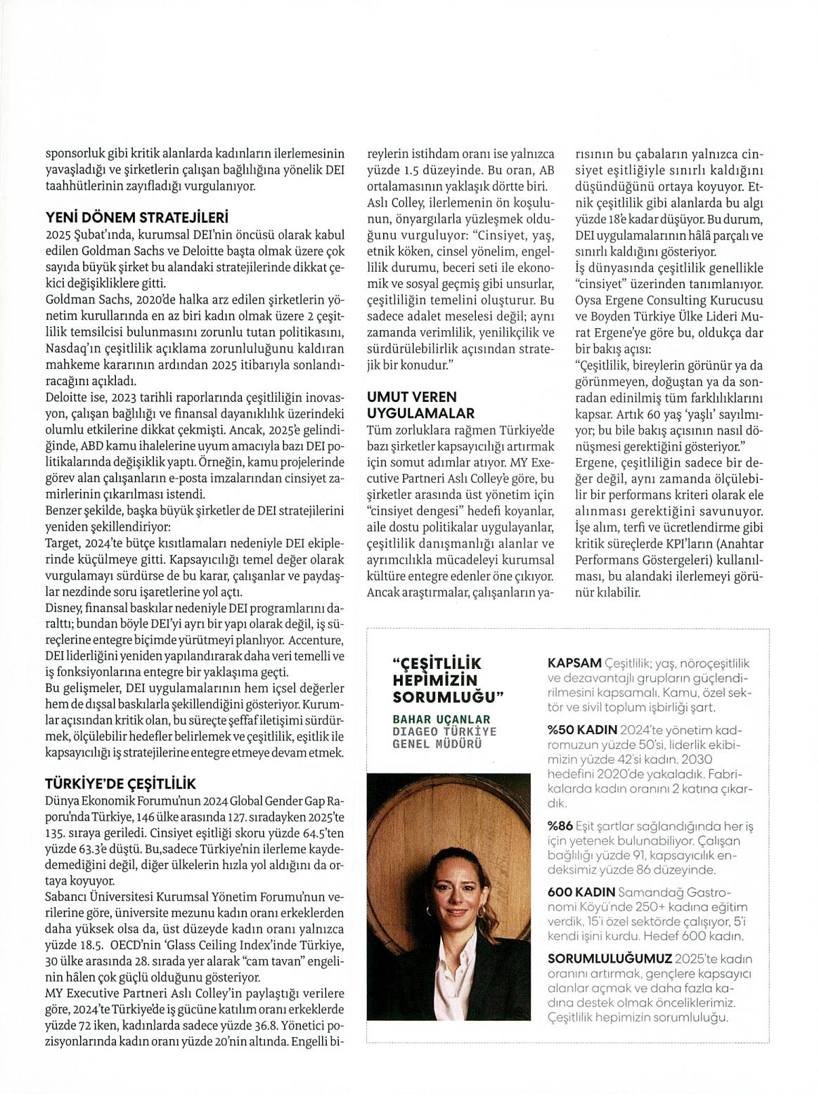 Uluslararası araştırmalar, son yıllarda DEI (Diversity, Equity & Inclusion - Çeşitlilik, Eşitlik ve Kapsayıcılık) yatırımlarının dünya genelinde giderek daha fazla kabul görmesine rağmen, uygulama açısından istenen seviyeye ulaşamadığını gösteriyor. Forrester ve McKinsey gibi kuruluşların verilerine göre, son yıllarda bu alandaki yatırımlarda bir azalma gözleniyor. Türkiye'de ise DEI kavramı çoğu zaman yalnızca "çeşitlilik" boyutuna, hatta sadece cinsiyet temsiliyle sınırlı bir bakış açısına indirgeniyor. Oysa gerçek bir dönüşüm; kapsayıcılık ve eşitlik ilkelerini de içeren bütüncül bir yaklaşımı gerektiriyor.