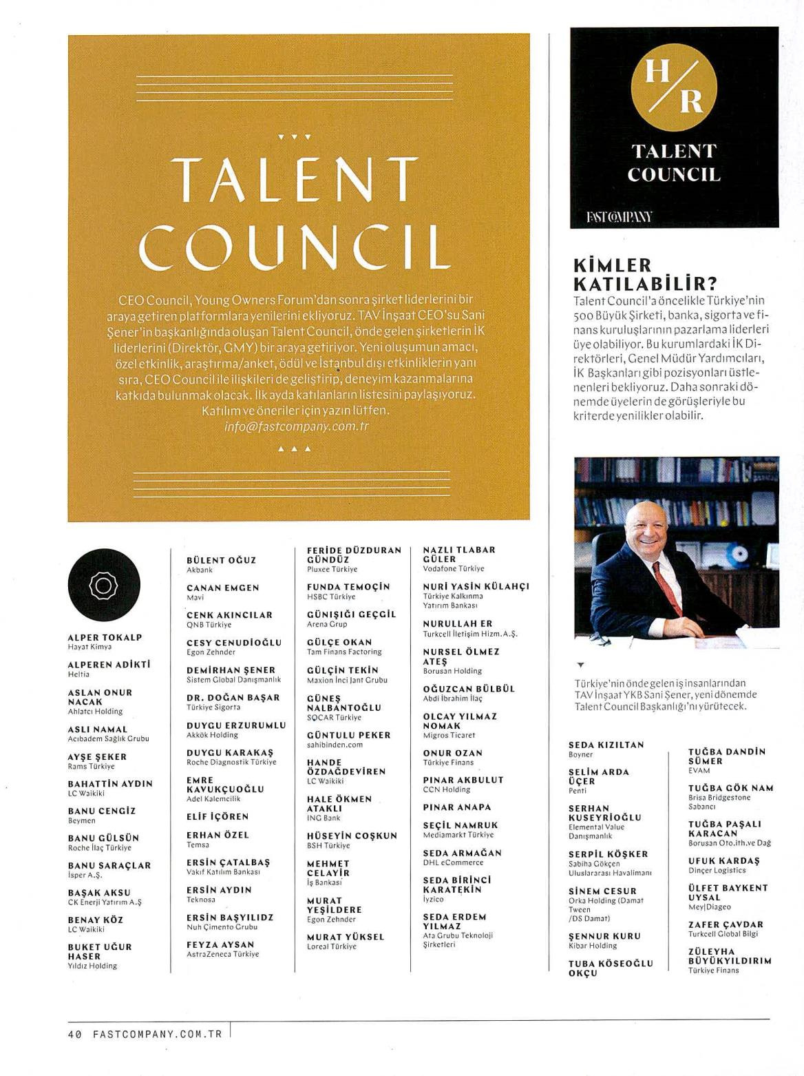 CEO Council ve Young Owners Forum'dan sonra şirket liderlerini bir araya getiren platformlara yenilerini ekliyoruz. TAV İnşaat CEO’su Sani Şener’in başkanlığında oluşan Talent Council, önde gelen şirketlerin İK liderlerini (Direktör, GMY) bir araya getiriyor. Yeni oluşumun amacı; özel etkinlik, araştırma/anket, ödül ve İstanbul dışı etkinliklerin yanı sıra, CEO Council ile ilişkileri de geliştirip deneyim kazanmalarına katkıda bulunmak olacak.