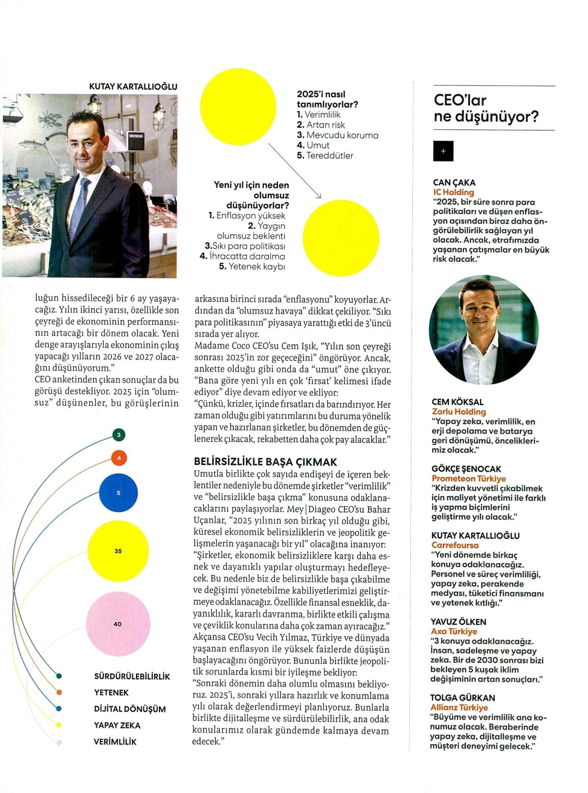 Umutla birlikte çok sayıda endişeyi de içeren beklentiler nedeniyle bu dönemde şirketler "verimlilik" ve "belirsizlikle başa çıkma" konusuna odaklanacaklarını paylaşıyorlar. Mey|Diageo CEO'su Bahar Uçanlar, "2025 yılının son birkaç yıl olduğu gibi, küresel ekonomik belirsizliklerin ve jeopolitik gelişmelerin yaşanacağı bir yıl" olacağına inanıyor: "Şirketler, ekonomik belirsizliklere karşı daha esnek ve dayanıklı yapılar oluşturmayı hedefleyecek. Bu nedenle biz de belirsizlikle başa çıkabilme ve değişimi yönetebilme kabiliyetlerimizi geliştirmeye odaklanacağız. Özellikle finansal esneklik, dayanıklılık, kararlı davranma, birlikte etkili çalışma ve çeviklik konularına daha çok zaman ayıracağız." Akçansa CEO'su Vecih Yılmaz, Türkiye ve dünyada yaşanan enflasyon ile yüksek faizlerde düşüşün başlayacağını öngörüyor. Bununla birlikte jeopolitik sorunlarda kısmi bir iyileşme bekliyor: "Sonraki dönemin daha olumlu olmasını bekliyoruz. 2025'i, sonraki yıllara hazırlık ve konumlama yılı olarak değerlendirmeyi planlıyoruz. Bunlarla birlikte dijitalleşme ve sürdürülebilirlik, ana odak konularımız olarak gündemde kalmaya devam edecek."