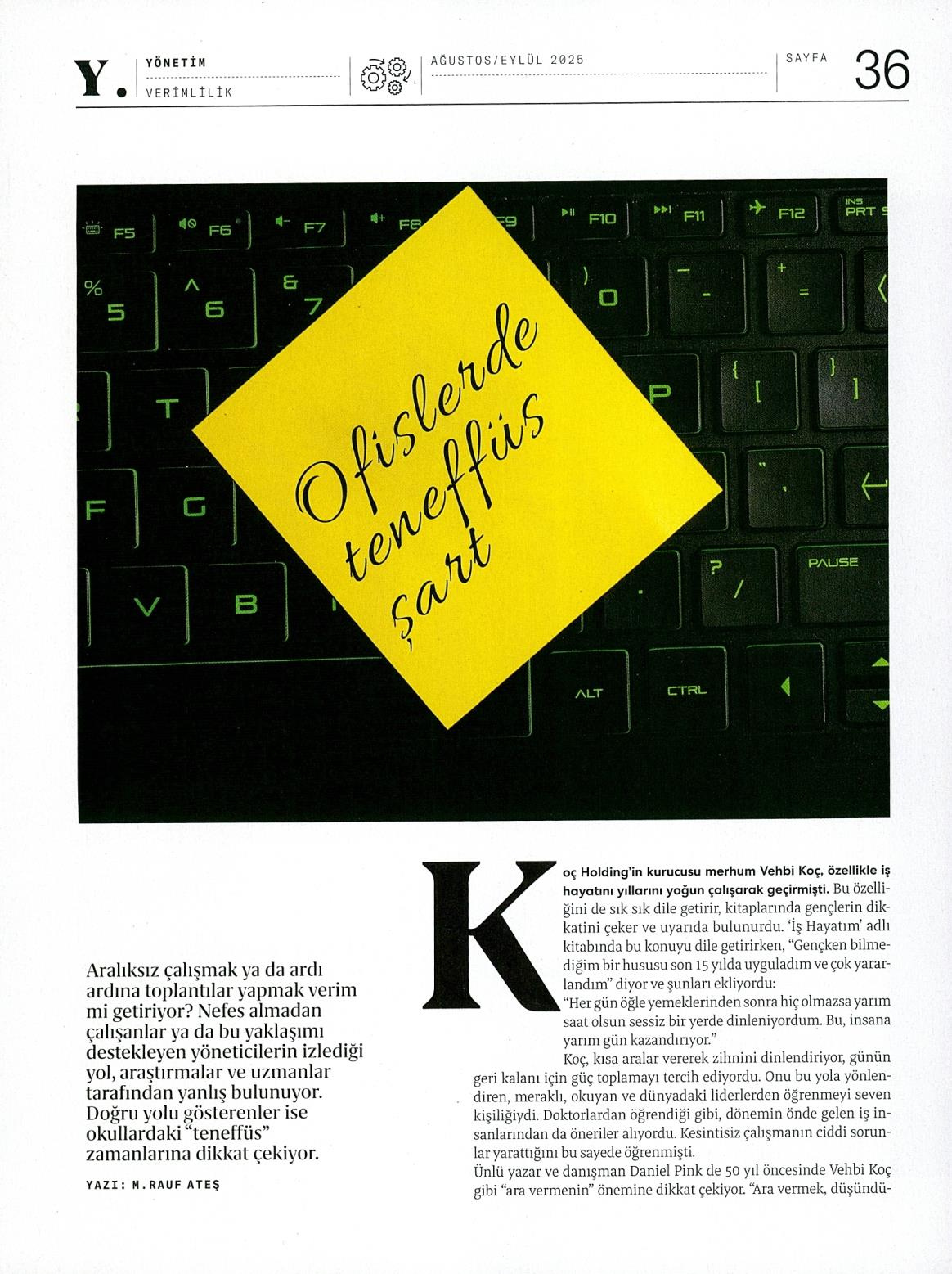 Ünlü yazar ve danışman Daniel Pink de 50 yıl öncesinde Vehbi Koç gibi "ara vermenin" önemine dikkat çekiyor. "Ara vermek, düşündüğümüzden çok daha güçlüdür" diyor. Ona göre 1-2 dakikalık "mikro aralar" bile odaklanmayı ve zihni güçlendirir. "Eğer bu aranın içine doğayı da katarsanız, etkisi daha yüksek olur" diye ekliyor. Daniel Pink, "Daha fazlasını mı istiyorsanız" sözleriyle önerisine devam ediyor: "Eğer süper şarj olmak istiyorsanız arayı sevdiğiniz biriyle yapın. Tamamen fişleri çekin, cihazlardan kurtulun. Örneğin, 10 dakikalık bir yürüyüş, işten tamamen uzaklaşmak çok iyi olur. Üstelik sadece birey için değil, şirkete de büyük etki yapabilir."