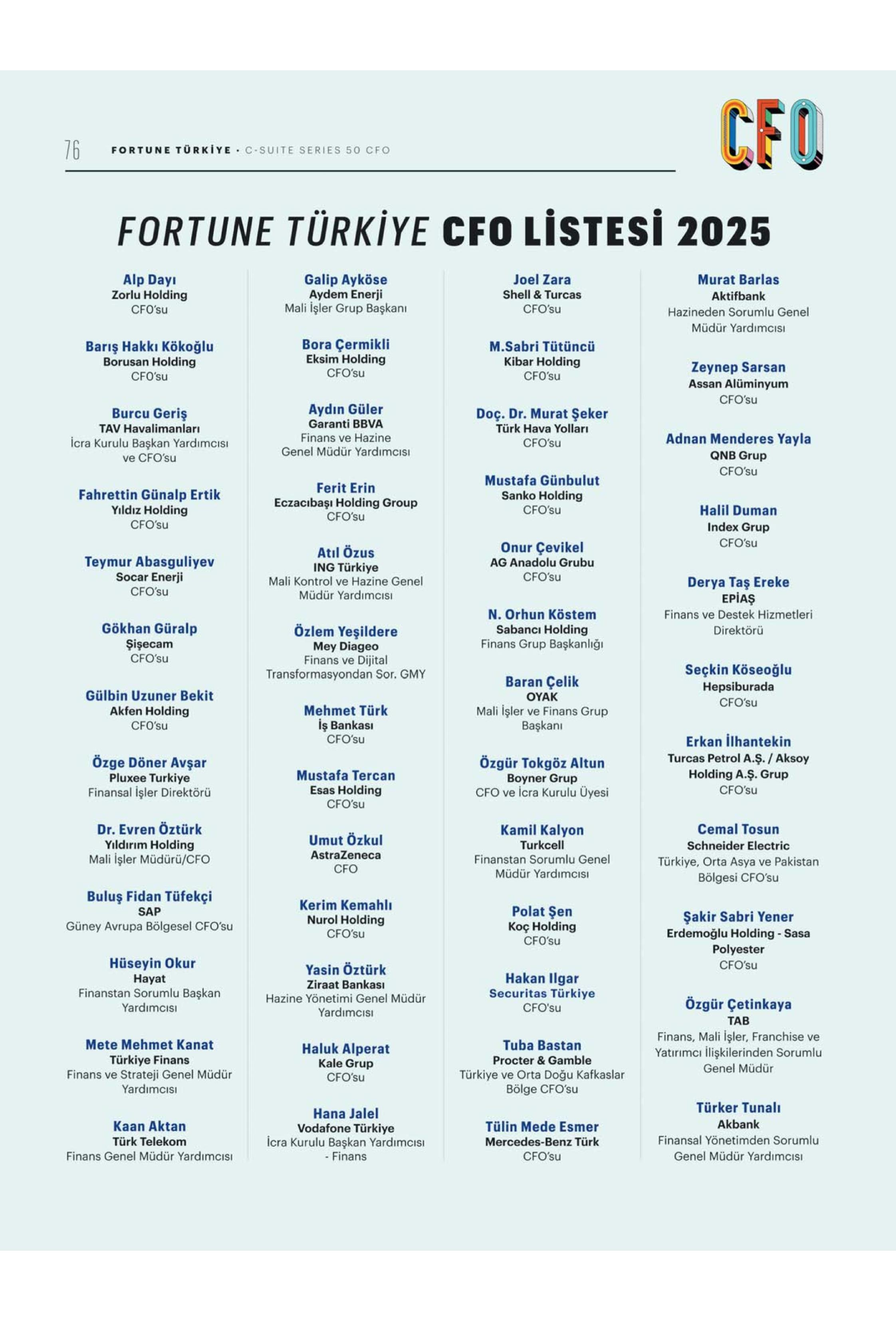 Fortune un globalde geliri en az 1 milyar dolar olan kuruluşlarda çalışan CFOlarla yaptığı araştırmaya göre; CFOların 2025 için en önemli önceliklerinin başında kurumsal risk yönetimi dikkat çekiyor. Bunu çevikliği artırmak için teknoloji odaklı stratejiler ve kararlar takip ediyor. CFOlar için endişe verici konular; ekonomi (% 56), jeopolitik (% 46) ve faiz oranlan (% 44) Ankete katılanlann % 47'si, gelecek yıl şirketlerinin küresel değer zincirinin bazı bölümlerini yeniden konumlandırmak için seçenekleri araştıracağını söylüyor. CFO'lann en önemli iç riskleri ise; üretken yapay zeka, çeviklik, verimlilik ve üretkenlik. Fortune un 2025 C-Suite Series 50 CFO- Finans Liderleri listesi de Fortune 500 Türkiye Listesinde yer alan dev şirketlerin CFOlarının ajandaları ve hedefleriyle ilgili sonuçlar veriyor: Türkiye'de Finans Başkanları (CFOlar), finans fonksiyonunu yeniden şekillendirirken hem uzun vadeli değer yaratmaya hem de kısa vadeli maliyet verimliliği bulmaya çalışıyorlar. Gelecek dönem öncelikli yatınmlan azaltma baskısıyla karşı karşıyayken uzun vadeli değer yaratmak, finans alanında daha cesur ve daha yenilikçi değişimlerle değer yaratırken riski yönetmeyi gündemlerinde tutuyorlar.