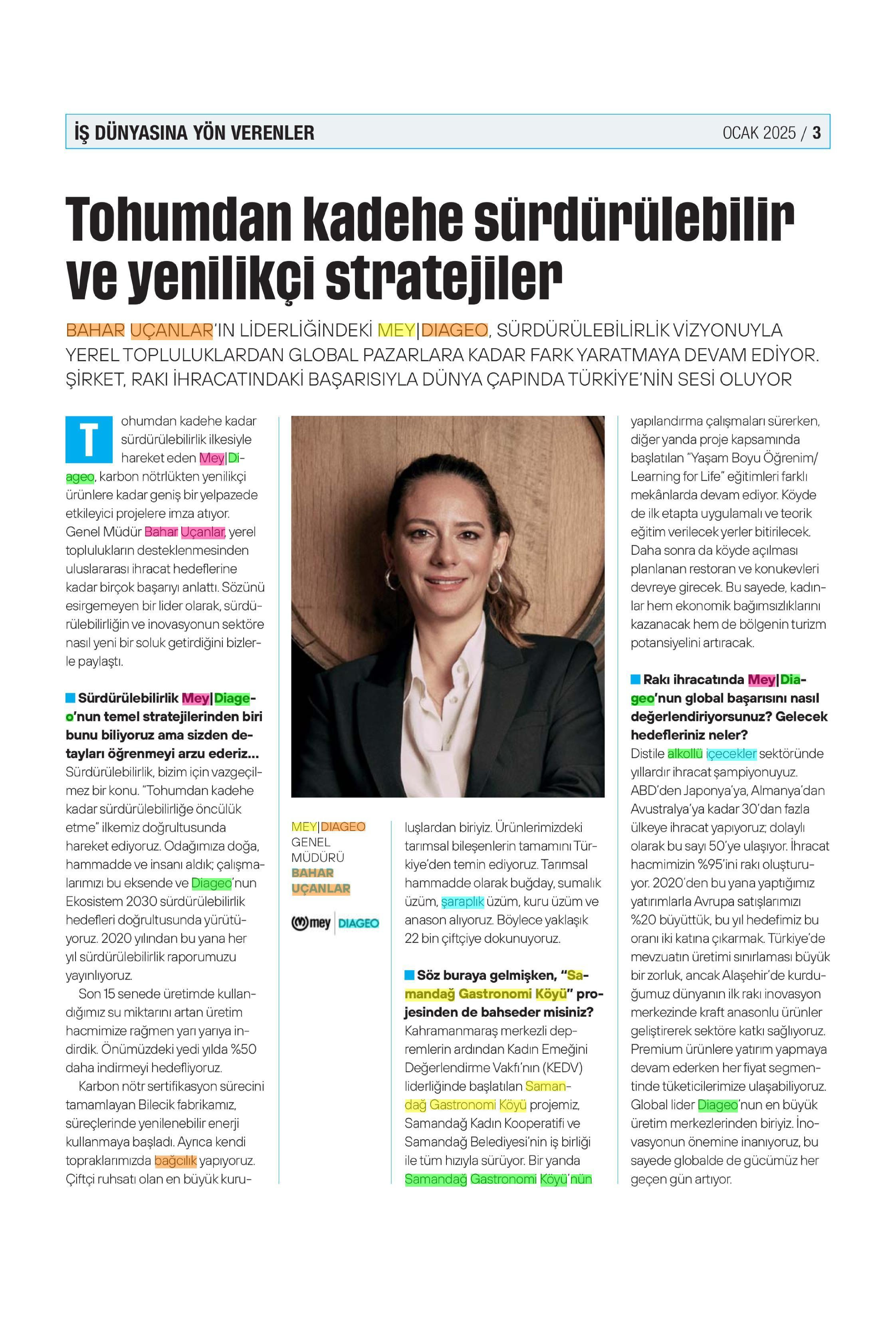 Tohumdan kadehe kadar sürdürülebilirlik ilkesiyle hareket eden Mey|Diageo, karbon nötrlükten yenilikçi ürünlere kadar geniş bir yelpazede etkileyici projelere imza atıyor. Genel Müdür Bahar Uçanlar, yerel toplulukların desteklenmesinden uluslararası ihracat hedeflerine kadar birçok başarıyı anlattı. Sözünü esirgemeyen bir lider olarak, sürdürülebilirliğin ve inovasyonun sektöre nasıl yeni bir soluk getirdiğini bizimle paylaştı.