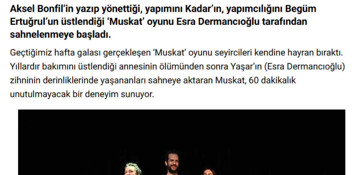 Geçtiğimiz hafta galası gerçekleşen ‘Muskat’ oyunu seyircileri kendine hayran bıraktı. Yıllardır bakımını üstlendiği annesinin ölümünden sonra Yaşar’ın (Esra Dermancıoğlu) zihninin derinliklerinde yaşananları sahneye aktaran Muskat, 60 dakikalık unutulmayacak bir deneyim sunuyor.