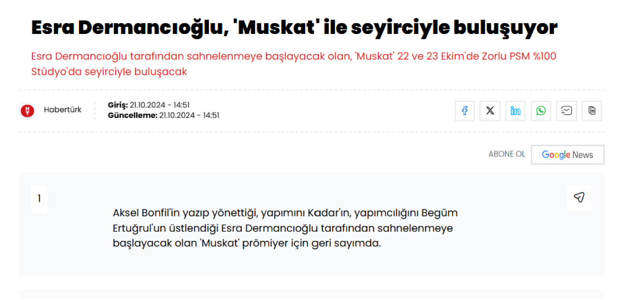 Aksel Bonfil'in yazıp yönettiği, yapımını Kadar'ın, yapımcılığını Begüm Ertuğrul'un üstlendiği Esra Dermancıoğlu tarafından sahnelenmeye başlayacak olan 'Muskat' prömiyer için geri sayımda.
