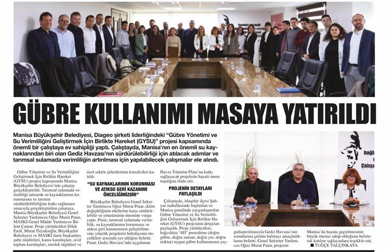 Manisa Büyükşehir Belediyesi, Diageo şirketi liderliğindeki "Gübre Yönetimi ve Su Verimliliğini Geliştirmek İçin Birlikte Hareket (GYSU)" projesi kapsamında önemli bir çalıştaya ev sahipliği yaptı. Çalıştayda, Manisa'nın en önemli su kaynaklarından biri olan Gediz Havzası'nın sürdürülebilirliği için atılacak adımlar ve tarımsal sulamada verimliliğin artırılması için yapılabilecek çalışmalar ele alındı. Gübre Yönetimi ve Su Verimliliğini Geliştirmek İçin Birlikte Hareket (GYSU) projesi kapsamında Manisa Büyükşehir Belediyesi'nde çalıştay gerçekleştirildi. Tarımsal sulamada verimliliği artırarak su kaynaklarının korunmasına ve tarımın sürdürülebilirliğine katkı sağlaması amacıyla gerçekleştirilen çalıştaya, Manisa Büyükşehir Belediyesi Genel Sekreter Yardımcısı Oğuz Murat Pınar, MASKİ Genel Müdür Yardımcısı Bülent Çamur, Proje yürütücüleri Dilek Emil, Murat Tiryakioğlu, Büyükşehir Belediyesi ve MASKİ daire başkanları, şube müdürleri, kamu kuruluşları, sivil toplum kuruluşları, meslek örgütleri ve özel sektör şirketlerinin temsilcileri katıldı.
