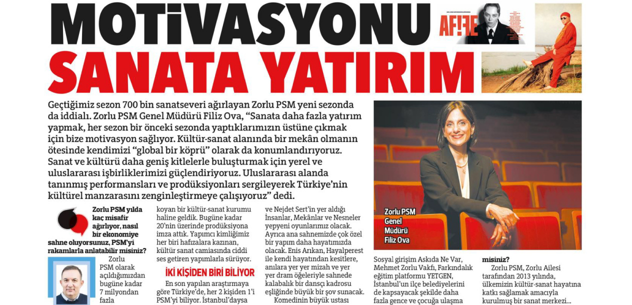 En son yapılan araştırmaya göre Türkiye'de, her 2 kişiden 1'i PSM'yi biliyor. İstanbul'daysa bu oran yüzde 90'a ulaşıyor: İstanbul'da her 10 kişiden 9'u ya Zorlu PSM'nin ismini duymuş ya da buradaki etkinliklere katılmış olduğunu söylüyor. Bu rakamlar doğru yolda olduğumuzun kanıtı. Sanata daha fazla yatırım yapmak, her sezon bir önceki sezonda yaptıklarımızın üstüne çıkmak için bize motivasyon sağlıyor. Geçen yıl nasıl geçti, yeni sezonda sürprizler var mı? Zorlu PSM olarak çok başarılı bir sezon geçirdik. 11. sezonumuzda sevilen konserlere, müzikallere, tiyatrolara, festivallere, stand up şovlara ve uluslararası yapımlara kadar izleyicilerimize unutulmaz deneyimler yaşattık. 12. sezonumuzu, 14 Eylül'de Demet Evgar'ın başrolünde olduğu ve Serdar Biliş'in yönettiği müzikli tiyatro oyunu "Afife" ile açtık. Afife Jale'nin yaşam öyküsünden ilham alınan eserde oyuncunun bir kadın olarak sahneye çıkma mücadelesi anlatılıyor.