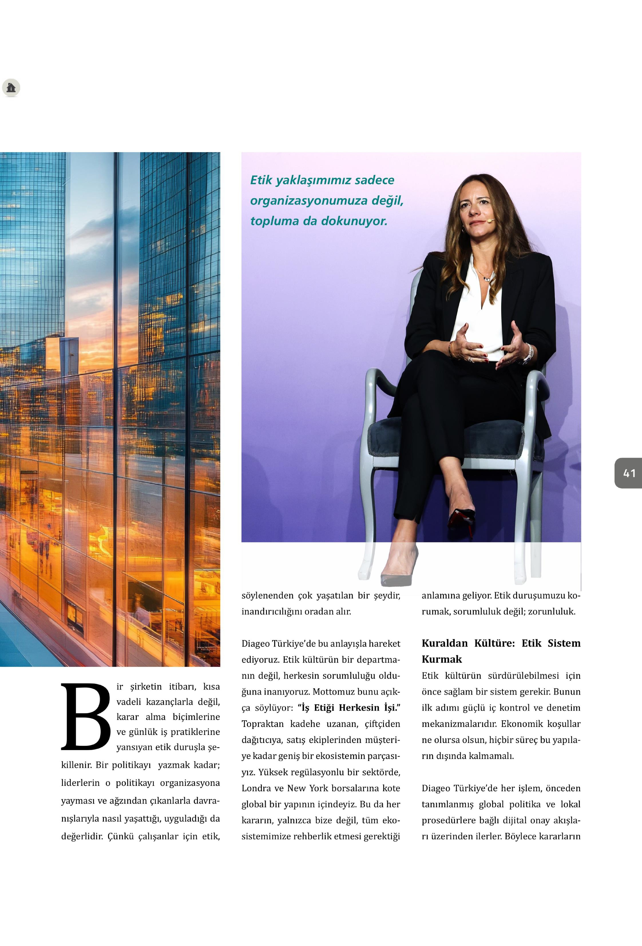 Bir şirketin itibarı, kısa vadeli kazançlarla değil, karar alma biçimlerine ve günlük iş pratiklerine yansıyan etik duruşla şekillenir. Bir politikayı yazmak kadar; liderlerin o politikayı organizasyona yayması ve davranışlarıyla nasıl yaşattığı da değerlidir. Çünkü çalışanlar için etik, söylenenden çok yaşatılan bir şeydir. Diageo Türkiye'de bu anlayışla hareket ediyoruz. Mottomuz bunu açıkça söylüyor: "İş Etiği Herkesin İşi."