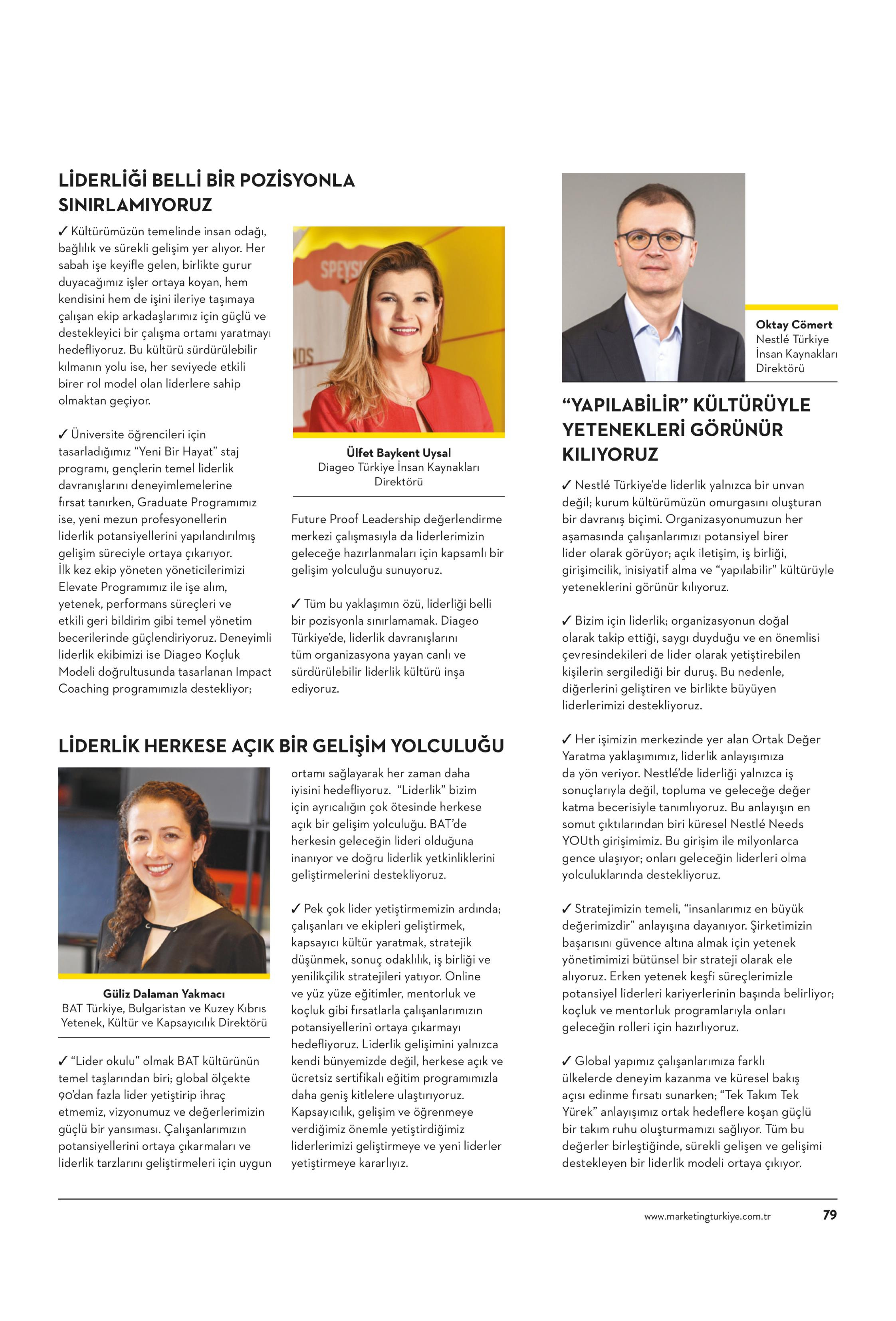 Kültürümüzün temelinde insan odağı, bağlılık ve sürekli gelişim yer alıyor. Her sabah işe keyifle gelen, birlikte gurur duyacağımız işler ortaya koyan, hem kendisini hem de işini ileriye taşımaya çalışan ekip arkadaşlarımız için güçlü ve destekleyici bir çalışma ortamı yaratmayı hedefliyoruz. Bu kültürü sürdürülebilir kılmanın yolu ise, her seviyede etkili birer rol model olan liderlere sahip olmaktan geçiyor.