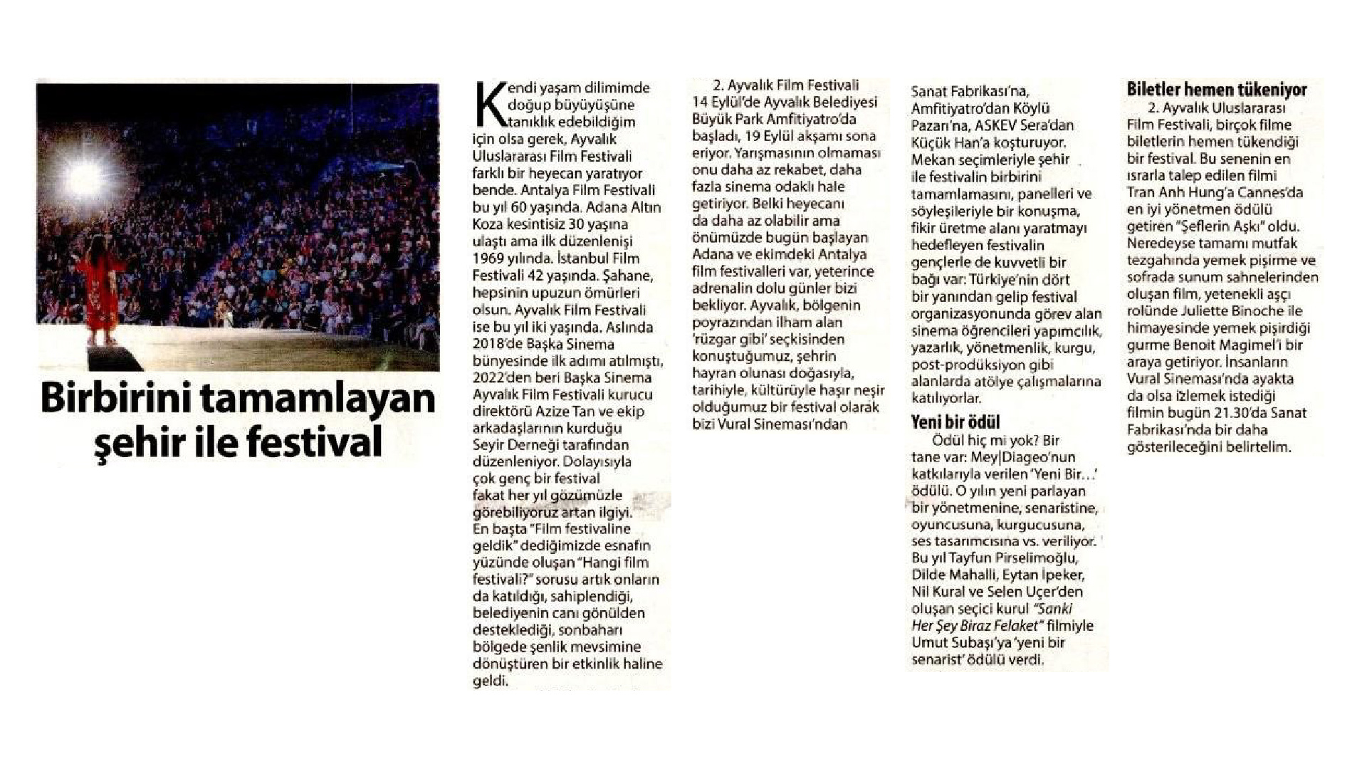 Kendi yaşam dilimimde doğup büyüyüşüne tanıklık edebildiğim için olsa gerek, Ayvalık Uluslararası Film Festivali farklı bir heyecan yaratıyor bende. Antalya Film Festivali bu yıl 60 yaşında. Adana Altın Koza kesintisiz 30 yaşına ulaştı ama ilk düzenlenişi 1969 yılında. İstanbul Film Festivali 42 yaşında. Şahane, hepsinin upuzun ömürleri olsun. Ayvalık Film Festivali ise bu yıl iki yaşında. Aslında 2018'de Başka Sinema bünyesinde ilk adımı atılmıştı, 2022'den beri Başka Sinema Ayvalık Film Festivali kurucu direktörü Azize Tan ve ekip arkadaşlarının kurduğu Seyir Derneği tarafından düzenleniyor. Dolayısıyla çok genç bir festival fakat her yıl gözümüzle görebiliyoruz artan ilgiyi. En başta "Film festivaline geldik" dediğimizde esnafın yüzünde oluşan "Hangi film festivali?" sorusu artık onların da katıldığı, sahiplendiği, belediyenin canı gönülden desteklediği, sonbaharı bölgede şenlik mevsimine dönüştüren bir etkinlik haline geldi.