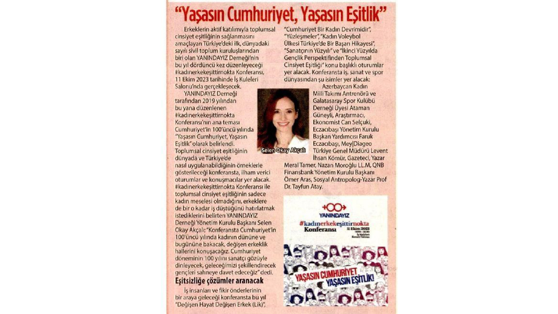 Erkeklerin aktif katılımıyla toplumsal cinsiyet eşitliğinin sağlanmasını amaçlayan Türkiye'deki ilk, dünyadaki sayılı sivil toplum kuruluşlarından biri olan YANINDAYIZ Derneği'nin bu yıl dördüncü kez düzenleyeceği #kadınerkekeşittirnokta Konferansı, 11 Ekim 2023 tarihinde İş Kuleleri Salonu'nda gerçekleşecek. YANINDAYIZ Derneği tarafından 2019 yılından bu yana düzenlenen #kadınerkekeşittirnokta Konferansı'nın ana teması Cumhuriyet'in 100'üncü yılında "Yaşasın Cumhuriyet, Yaşasın Eşitlik" olarak belirlendi. Toplumsal cinsiyet eşitliğinin dünyada ve Türkiye'de nasıl uygulanabildiğinin örneklerle gösterileceği konferansta, ilham verici oturumlar ve konuşmacılar yer alacak. #kadınerkekeşittirnokta Konferansı ile toplumsal cinsiyet eşitliğinin sadece kadın meselesi olmadığını, erkeklere de bir o kadar iş düştüğünü hatırlatmak istediklerini belirten YANINDAYIZ Derneği Yönetim Kurulu Başkanı Selen Okay Akçalı; "Konferansta Cumhuriyet'in 100'üncü yılında kadının dününe ve bugününe bakacak, değişen erkeklik hallerini konuşacağız. Cumhuriyet döneminin 100 yılını sanatçı gözüyle dinleyecek, geleceğimizi şekillendirecek gençleri sahneye davet edeceğiz" dedi.