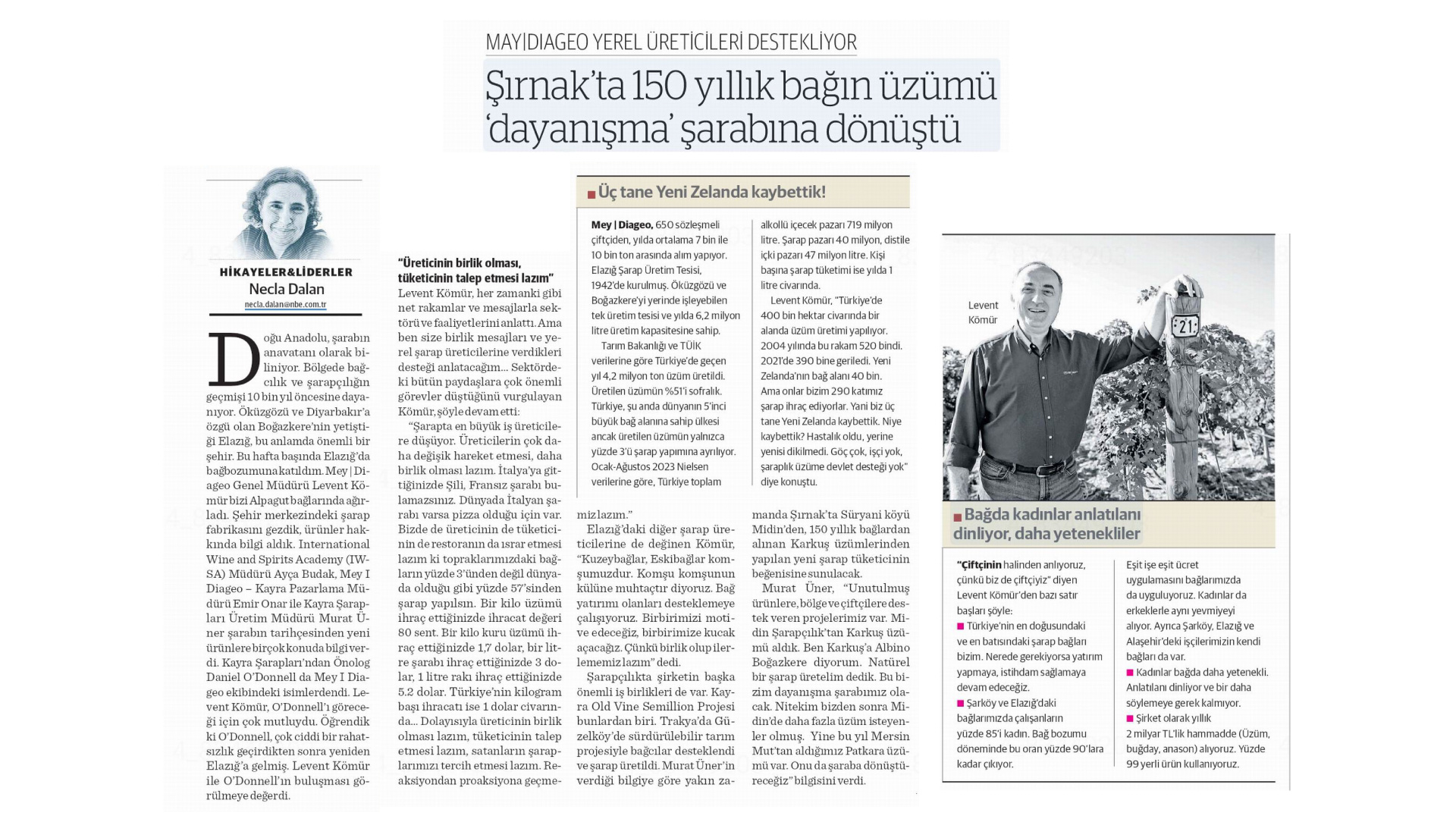 Mey | Diageo, 650 sözleşmeli çiftçiden, yılda ortalama 7 bin ile 10 bin ton arasında alım yapıyor. Elazığ Şarap Üretim Tesisi, 1942’de kurulmuş. Öküzgözü ve Boğazkere’yi yerinde işleyebilen tek üretim tesisi ve yılda 6,2 milyon litre üretim kapasitesine sahip. Tarım Bakanlığı ve TÜİK verilerine göre Türkiye’de geçen yıl 4,2 milyon ton üzüm üretildi. Üretilen üzümün %51’i sofralık. Türkiye, şu anda dünyanın 5’inci büyük bağ alanına sahip ülkesi ancak üretilen üzümün yalnızca yüzde 3’ü şarap yapımına ayrılıyor. Ocak-Ağustos 2023 Nielsen verilerine göre, Türkiye toplam alkollü içecek pazarı 719 milyon litre. Şarap pazarı 40 milyon, distile içki pazarı 47 milyon litre. Kişi başına şarap tüketimi ise yılda 1 litre civarında. Levent Kömür, “Türkiye’de 400 bin hektar civarında bir alanda üzüm üretimi yapılıyor. 2004 yılında bu rakam 520 bindi. 2021’de 390 bine geriledi. Yeni Zelanda’nın bağ alanı 40 bin. Ama onlar bizim 290 katımız şarap ihraç ediyorlar. Yani biz üç tane Yeni Zelanda kaybettik. Niye kaybettik? Hastalık oldu, yerine yenisi dikilmedi. Göç çok, işçi yok, şaraplık üzüme devlet desteği yok” diye konuştu.