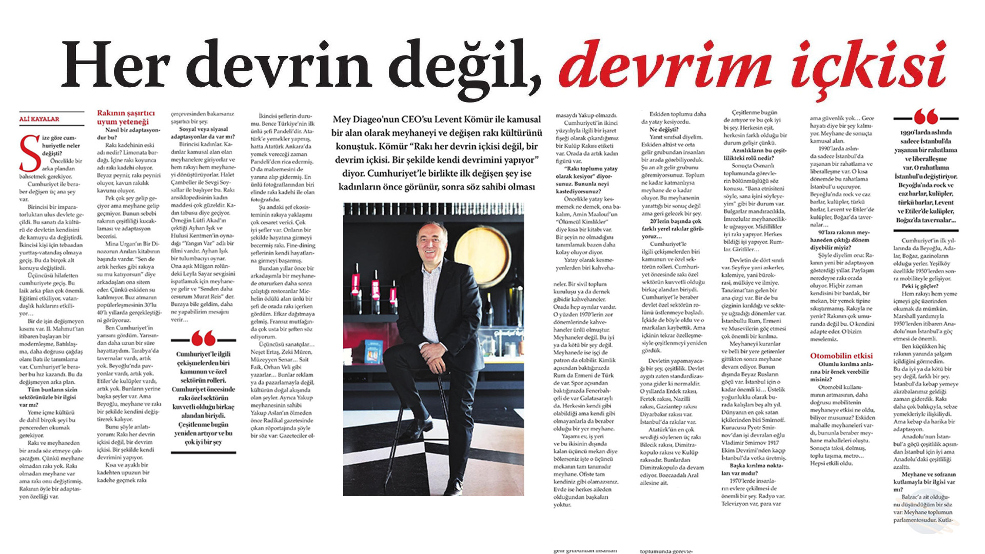 Mey Diageo'nun CEO'su Levent Kömür ile kamusal bir alan olarak meyhaneyi ve değişen rakı kültürünü konuştuk. Kömür "Rakı her devrin içkisi değil, bir devrim içkisi. Bir şekilde kendi devrimini yapıyor" diyor. Cumhuriyet'le birlikte ilk değişen şey ise kadınların önce görünür, sonra söz sahibi olması.