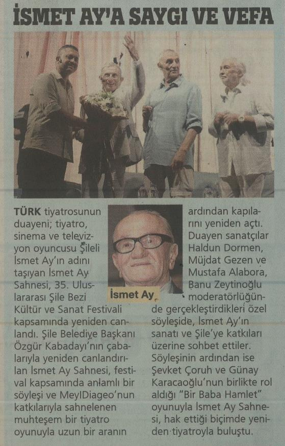 TÜRK tiyatrosunun duayeni; tiyatro, sinema ve televizyon oyuncusu Şileli Ismet Ay'ın adını taşıyan Ismet Ay Sahnesi, 35. Uluslararası Şile Bezi Kültür ve Sanat Festivali kapsamında yeniden canlandı. Şile Belediye Başkanı Özgür Kabadayı'nın çabalarıyla yeniden canlandırılan Ismet Ay Sahnesi, festival kapsamında anlamlı bir söyleşi ve MeylDiageo'nun katkılarıyla sahnelenen muhteşem bir tiyatro oyunuyla uzun bir aranın ardından kapılarını yeniden açtı. Duayen sanatçılar Haldun Dormen, Müjdat Gezen ve Mustafa Alabora, Banu Zeytinoğlu moderatörlüğünde gerçekleştirdikleri özel söyleşide, Ismet Ay'ın sanatı ve Şile'ye katkıları üzerine sohbet ettiler. Söyleşinin ardından ise Şevket Çoruh ve Günay Karacaoğlu'nun birlikte rol aldığı "Bir Baba Hamlet" oyunuyla Ismet Ay Sahnesi, hak ettiği biçimde yeniden tiyatroyla buluştu.