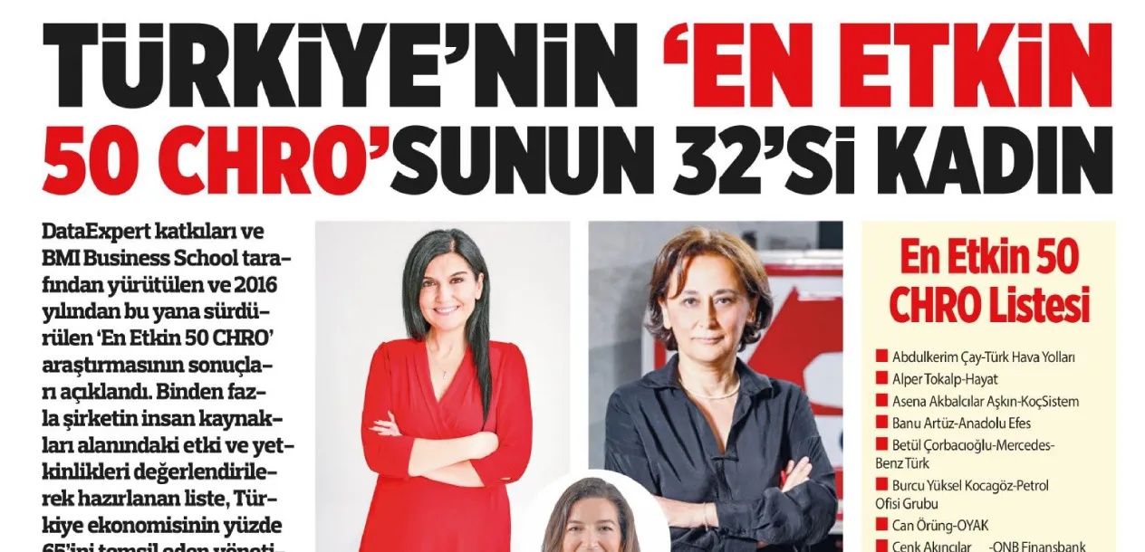 DataExpert katkıları ve BMI Business School tarafından yürütülen ve 2016 yılından bu yana sürdürülen 'En Etkin 50 CHRO' araştırmasının sonuçları açıklandı. Binden fazla şirketin insan kaynakları alanındaki etki ve yetkinlikleri değerlendirilerek hazırlanan liste, Türkiye ekonomisinin yüzde 65'ini temsil eden yöneticileri ve liderlerin sorumlu oldukları çalışan sayısının bin ile 70 bin arasında olduğu şirketleri kapsıyor. Geçen yıl en etkin İK yöneticilerinin yüzde 60'ını oluşturan kadın liderler, bu sene yüzde 64'lük bir orana ulaşarak 32 isimle listede yer aldı. Bu yıl 7'nci kez belirlenen 'En Etkin 50 CHRO'ya ödülleri 16 Ekim'de Re-Skilling in The Age of Al temasıyla gerçekleşecek CHRO Summit 2024'te takdim edilecek. DataExpert katkıları ve BMI Business School tarafından 7'ncisi yapılan 'En Etkin 50 CHRO' araştırmasının 2024 yılı sonuçları belli oldu. Adayların CHRO başarı kriterlerindeki performanslarının ve yetkinliklerinin Danışma Kurulu tarafından incelenmesiyle belirlenen En Etkin 50 CHRO listesinde bu yıl Türk Hava Yolları, Mercedes-Benz Türk, Petrol Ofisi Grubu, OYAK, QNB Finansbank, TEB, Siemens Healthineers, Kibar Holding, Turkcell, Eczacıbaşı Topluluğu, Şişecam, Hepsiburada, TAV Havalimanları Holding, Vodafone Türkiye, Tüpraş, Yapı Kredi, Akbank, L'Oreal Türkiye, IC Holding, Beko, Borusan Otomotiv, İGA İstanbul Havalimanı, Boyner Grup, Koç Holding ve Ford Otosan gibi ulusal ve uluslararası ölçekte faaliyet gösteren şirketlerin İK liderleri yer aldı. Sektör uzmanları ve akademisyenlerden oluşan Araştırma Danışma Kurulu tarafından saptanan kriterler çerçevesinde, performanslarıyla dikkat çeken Türkiye'nin En Etkin 50 İnsan Kaynakları Lideri'ne ödülleri; 16 Ekim'de Mandarin Oriental Bosphorus'ta gerçekleşecek olan CHRO Summit 2024'te takdim edilecek. Türkiye'nin insan kaynakları alanındaki önemli karar alıcılarına ve düşünce önderlerine ev sahipliği yapacak CHRO Summit 2024'te 23'ün üzerinde üst düzey konuşmacı yer alacak.
